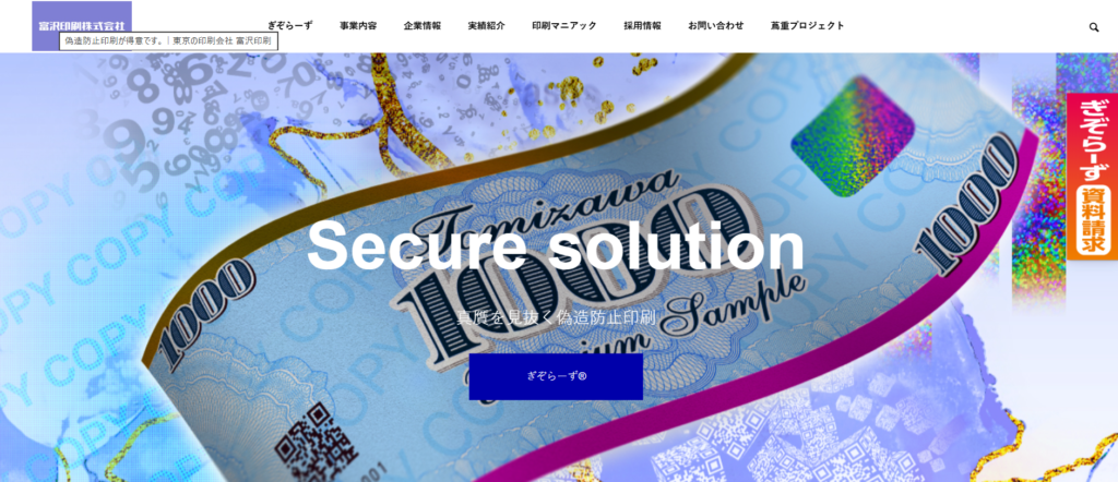 富沢印刷は、企画・デザインから印刷、製本、納品までをワンストップで提供する印刷会社です。中でも、コピーガードやホログラム、マイクロ文字などを組み合わせた独自の偽造防止印刷技術「ぎぞらーず®」を活かし、商品券や証明書、チケットなど、安心・安全が求められる印刷物の制作を得意としています。高精細印刷によるカタログやパンフレット、販促ツール、少部数に対応したオンデマンド印刷にも幅広く対応。さらに自社スタジオを活用した映像制作やオンライン配信サポートも行い、印刷の枠を超えた表現と価値づくりを支えています。